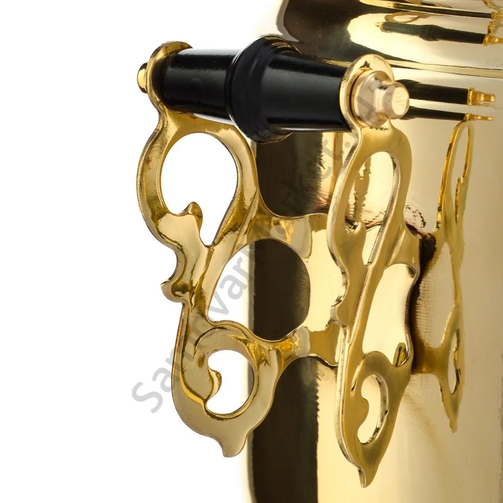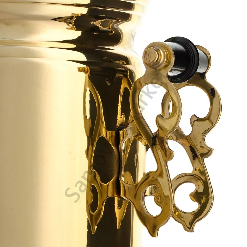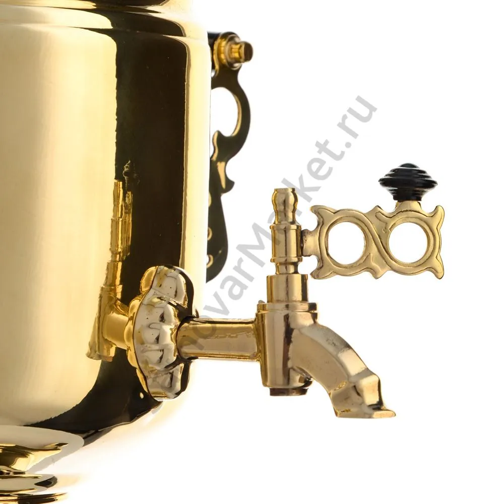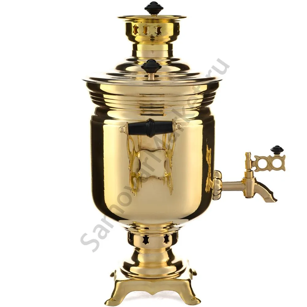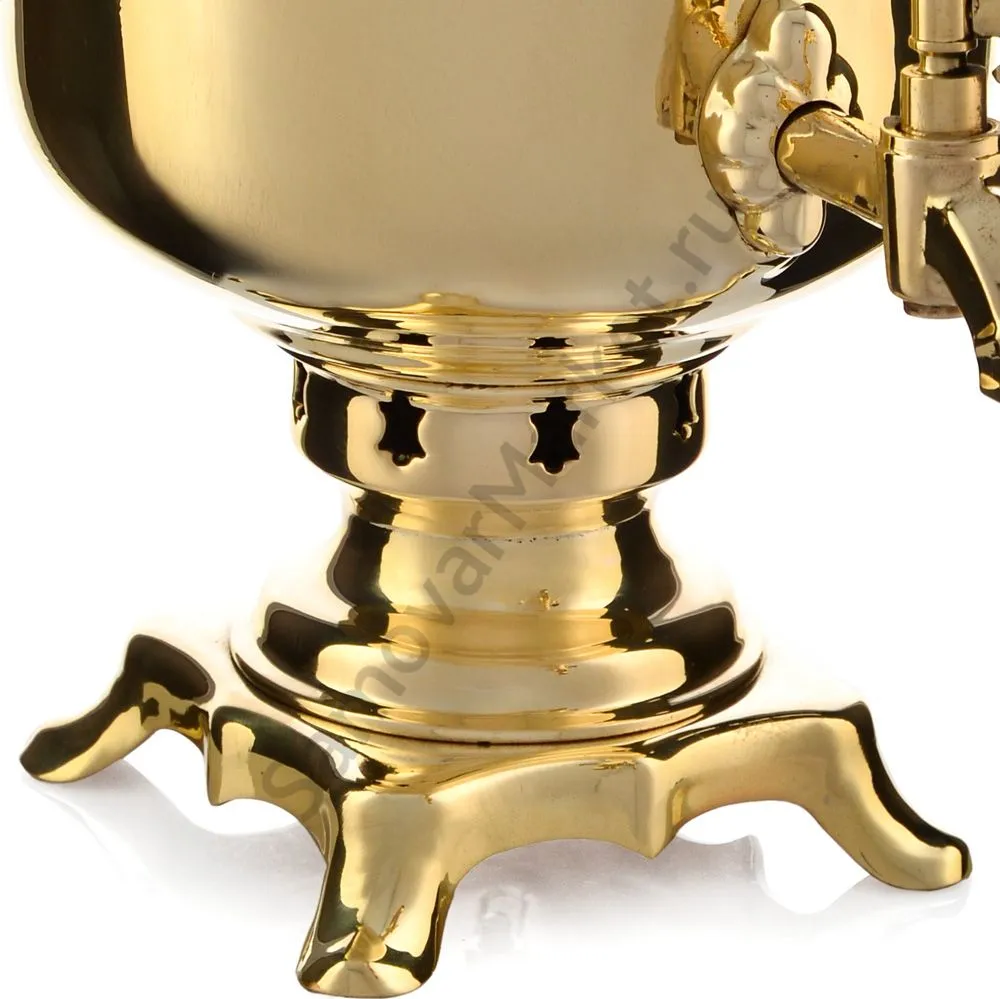 Этот самовар работает на дровах, углях, шишках, щепе. Топится он при помощи трубы, которая устанавливается сверху для образования тяги. Или при помощи сапога в качестве мехов. Внутренние стенки покрыты пищевым оловом методом гальваники.