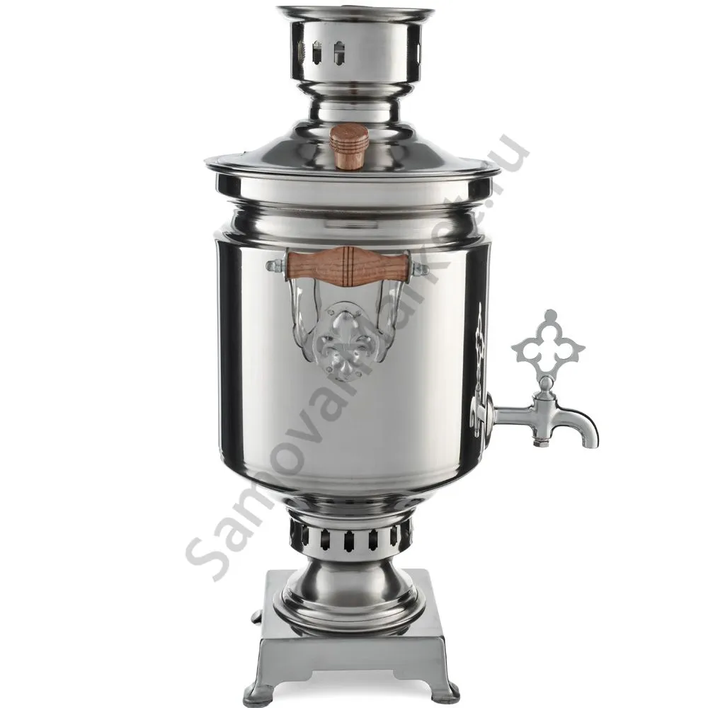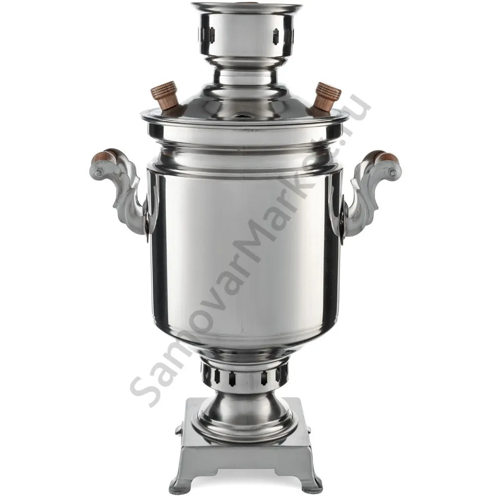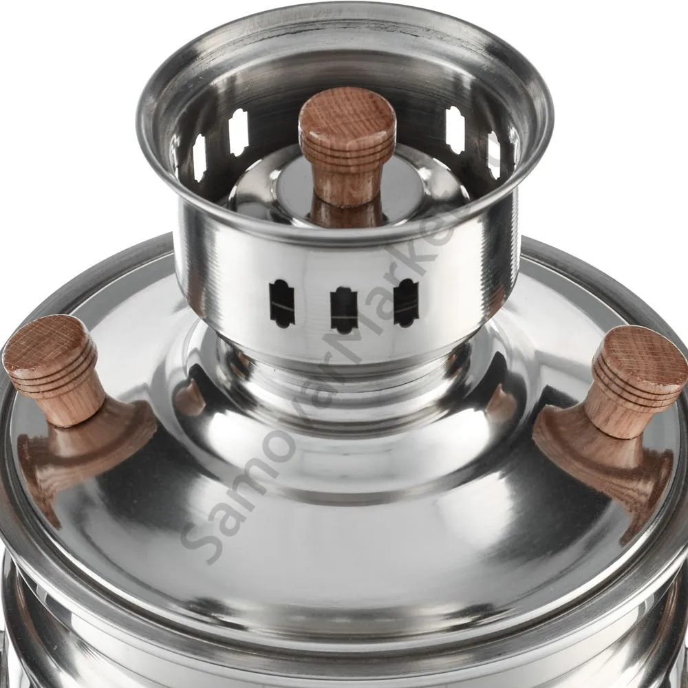 Ручки и хватки изготовлены из натурального дерева – берёзы, устойчивой к перепаду температур. Дерево затонировано в благородный и универсальный цвет с красивыми переливами специальной жароустойчивой краской и лаком. Полностью готов к применению. Изготовлено из нержавеющей стали, материала отлично сочетающегося с никелем по цвету. Как и никелированные самовары, нержавейка не тускнеет и не требует особого ухода. Сделано в России!