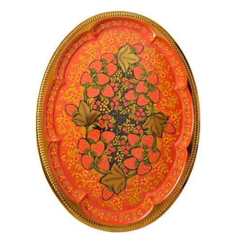 Поднос для самовара овальный с художественной росписью «Клубника в зелени №2 на красном»