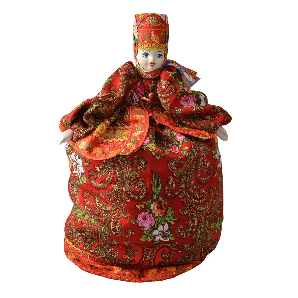 Кукла на самовар или на чайник является грелкой, которая сохранит чайник горячим и поможет в приготовлении по-русски насыщенного бархатного чая. Эту изысканную красавицу язык не поворачивается назвать бабой на чайник.