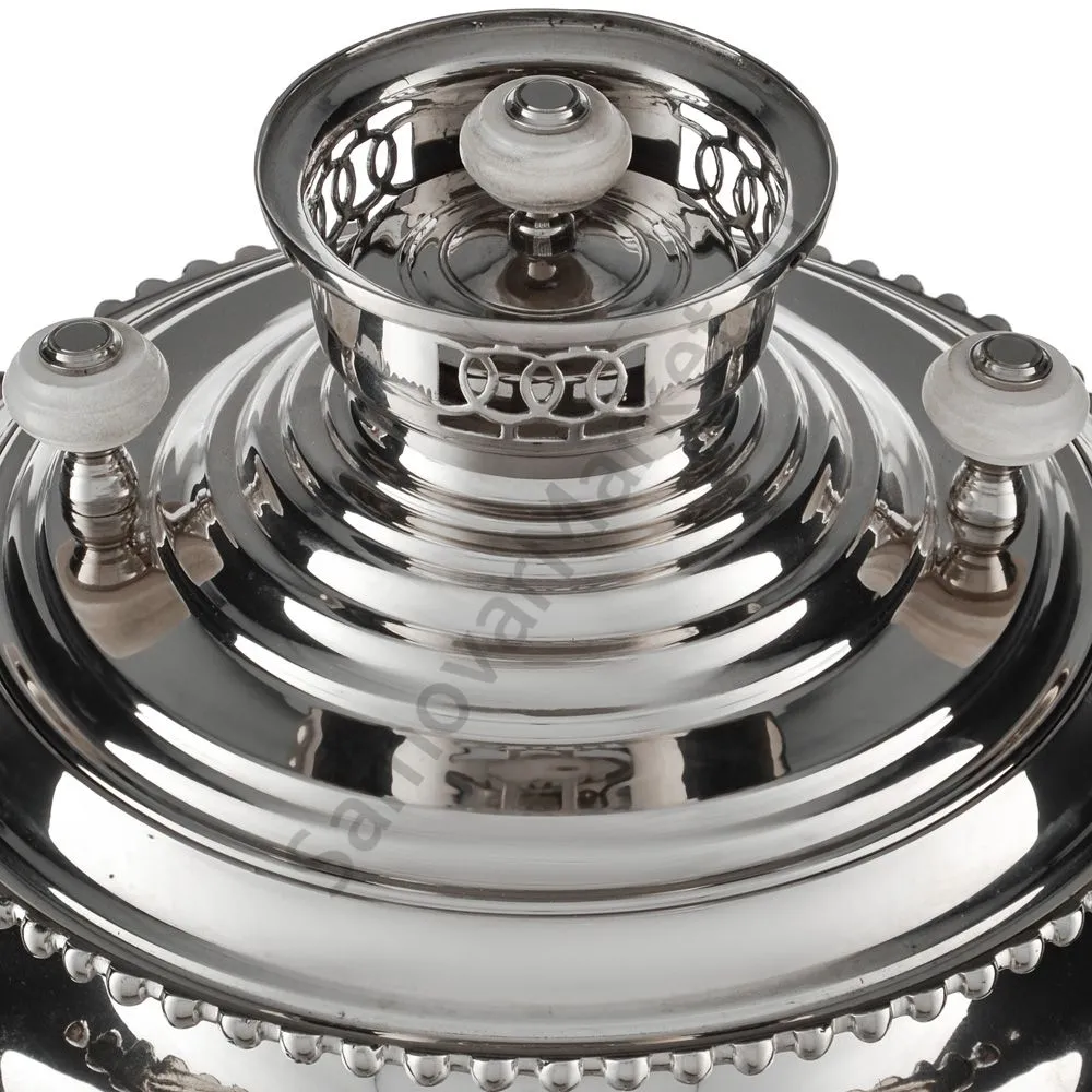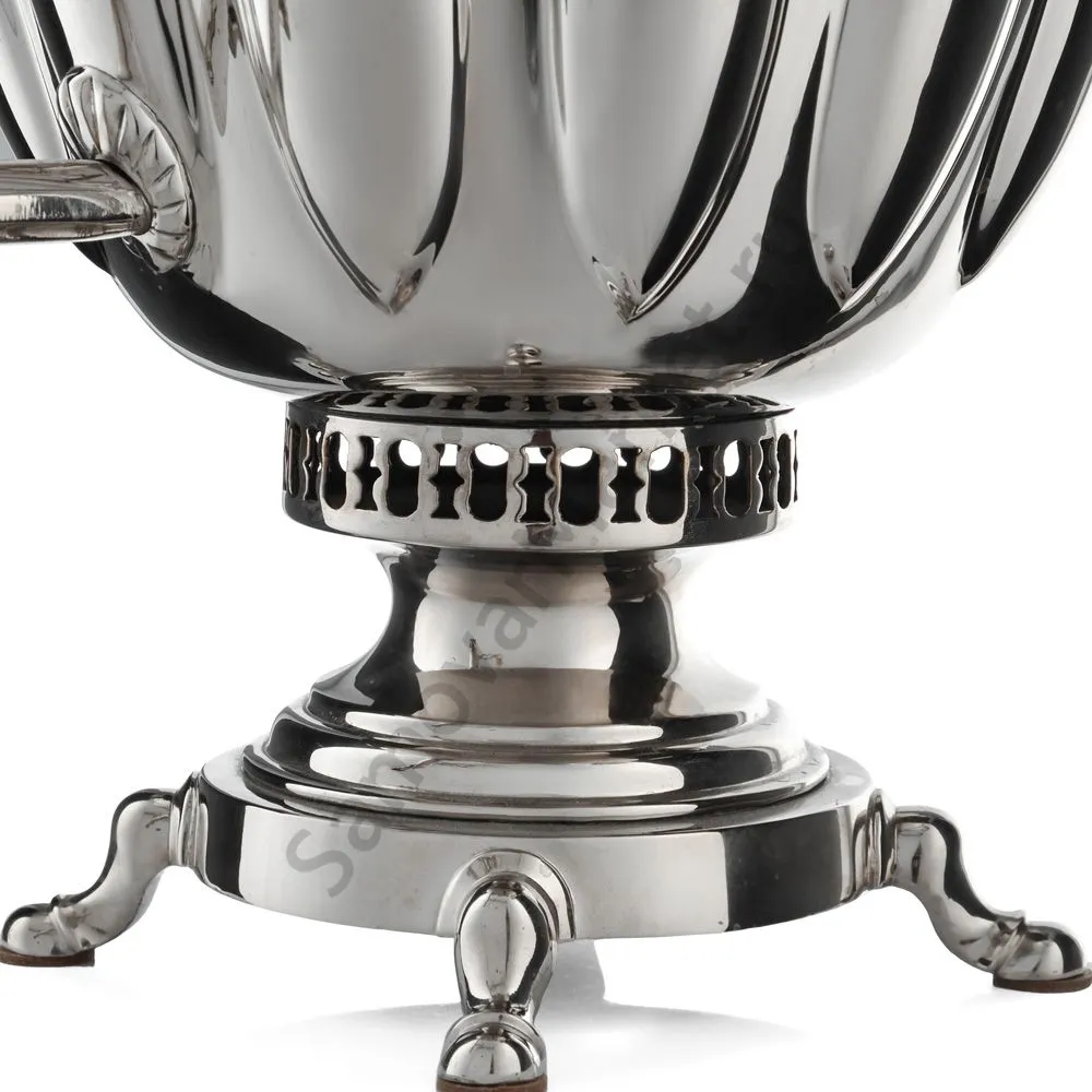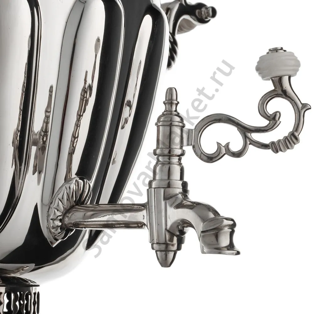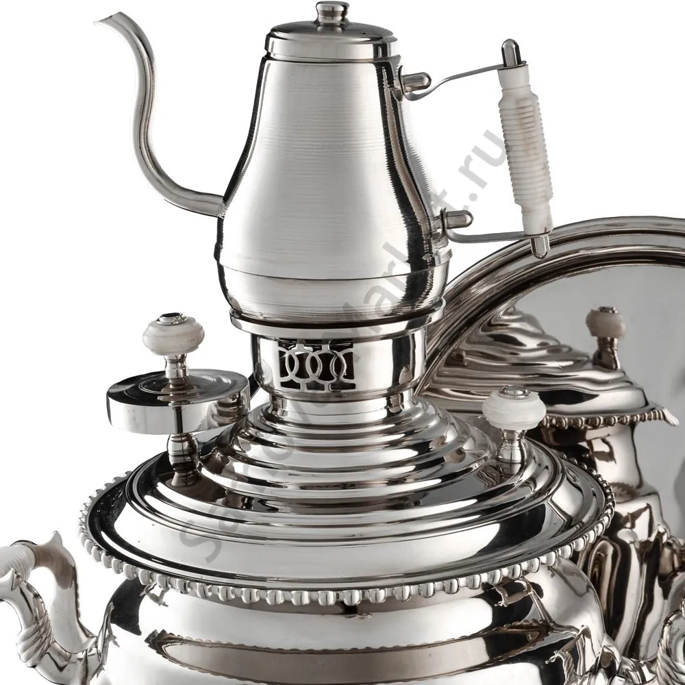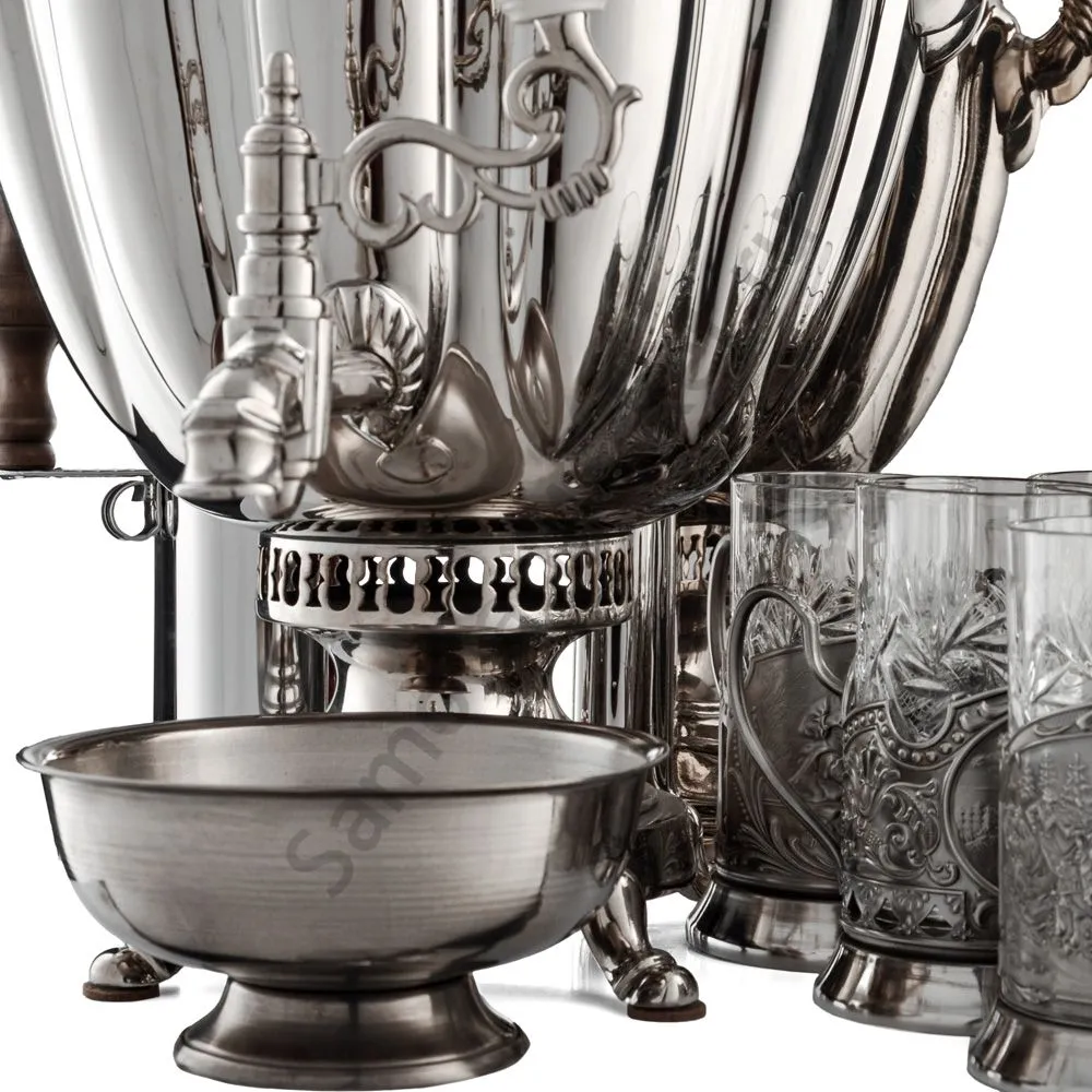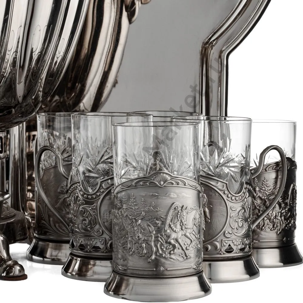 В набор с этим самоваром входят труба для тяги, антикварный поднос в форме замочной скважины, заварочный чайник с костяной, как и у самовара, фурнитурой, капельник и набор подстаканников с хрустальными стаканами, которые придают чаепитию особый вкус