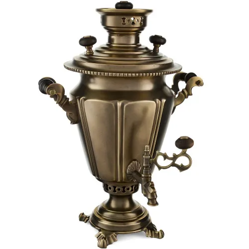 Этот самовар работает на дровах, углях, шишках, щепе. Топится он при помощи трубы, которая устанавливается сверху для образования тяги. Или при помощи сапога в качестве мехов. Внутренние стенки покрыты пищевым оловом методом гальваники.