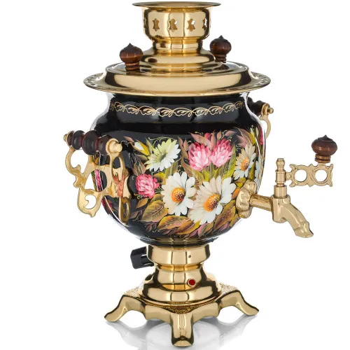 Работает от сети 220 V. К самовару прилагается шнур, красочная упаковка и инструкция по эксплуатации.