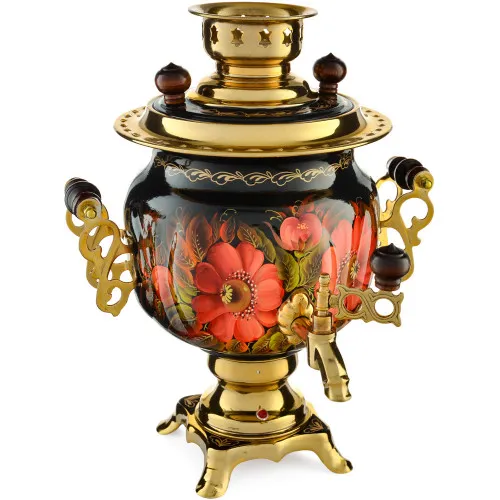 Ручки и хватки изготовлены из натурального дерева – берёзы, устойчивой к перепаду температур. Фурнитура роскошного глубокого каштанового цвета элитного красного дерева. Полностью готов к применению. Художественная роспись выполнена вручную специальными жаропрочными красками. Каждое изделие немного уникально и придает чаепитию особую красочность и даже праздничность. Сделано в Туле.