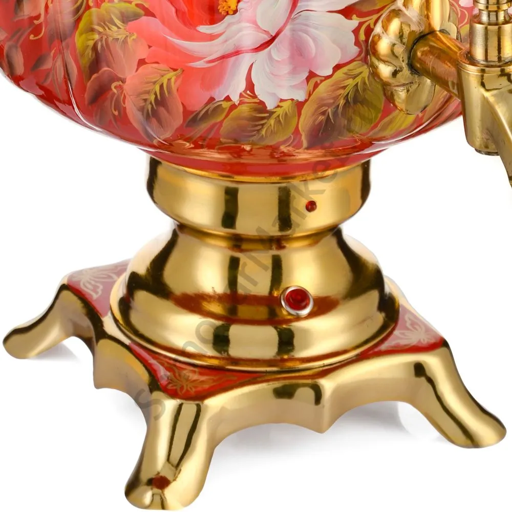 Работает от сети 220 V. К самовару прилагается шнур, красочная упаковка и инструкция по эксплуатации.