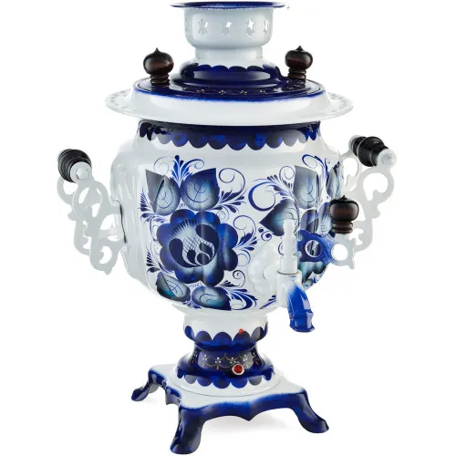 Работает от сети 220 V. К самовару прилагается шнур, красочная упаковка и инструкция по эксплуатации.
