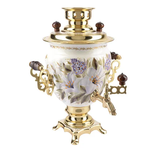 Ручки и хватки изготовлены из натурального дерева – берёзы, устойчивой к перепаду температур. Фурнитура роскошного глубокого каштанового цвета элитного красного дерева. Полностью готов к применению. Художественная роспись выполнена вручную специальными жаропрочными красками. Каждое изделие немного уникально и придает чаепитию особую красочность и даже праздничность. Сделано в Туле.