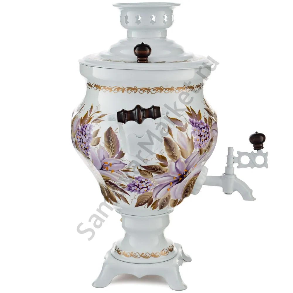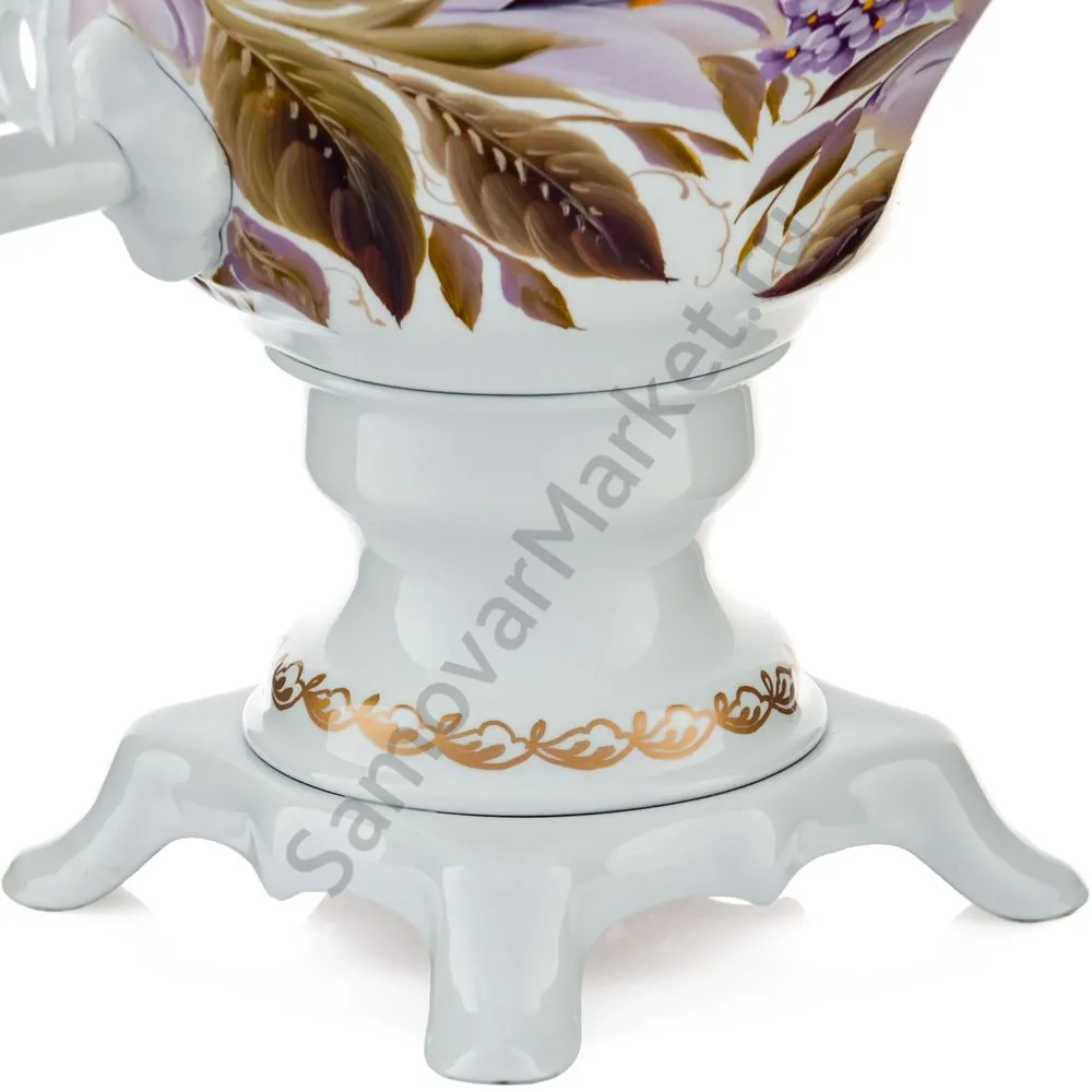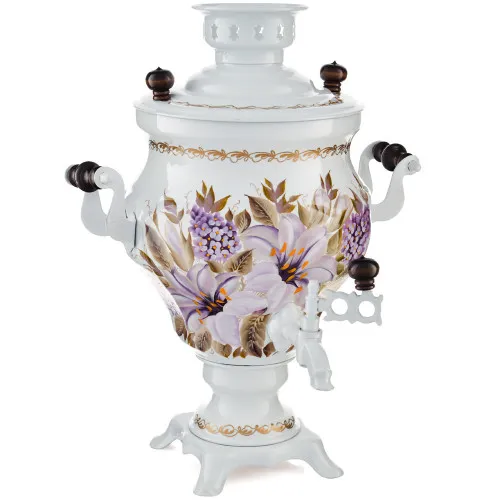 Работает от сети 220 V. К самовару прилагается шнур, красочная упаковка и инструкция по эксплуатации.