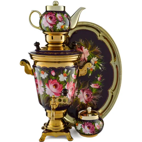 Ручки и хватки изготовлены из натурального дерева – берёзы, устойчивой к перепаду температур. Фурнитура роскошного глубокого каштанового цвета элитного красного дерева. Полностью готов к применению. Художественная роспись выполнена вручную специальными жаропрочными красками. Каждое изделие немного уникально и придает чаепитию особую красочность и даже праздничность. Сделано в Туле.