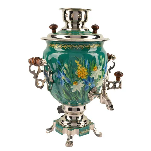 Работает от сети 220 V. К самовару прилагается шнур, красочная упаковка и инструкция по эксплуатации.