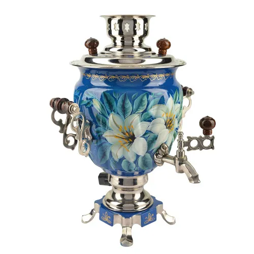 Ручки и хватки изготовлены из натурального дерева – берёзы, устойчивой к перепаду температур. Фурнитура роскошного глубокого каштанового цвета элитного красного дерева. Полностью готов к применению. Художественная роспись выполнена вручную специальными жаропрочными красками. Каждое изделие немного уникально и придает чаепитию особую красочность и даже праздничность. Сделано в Туле.