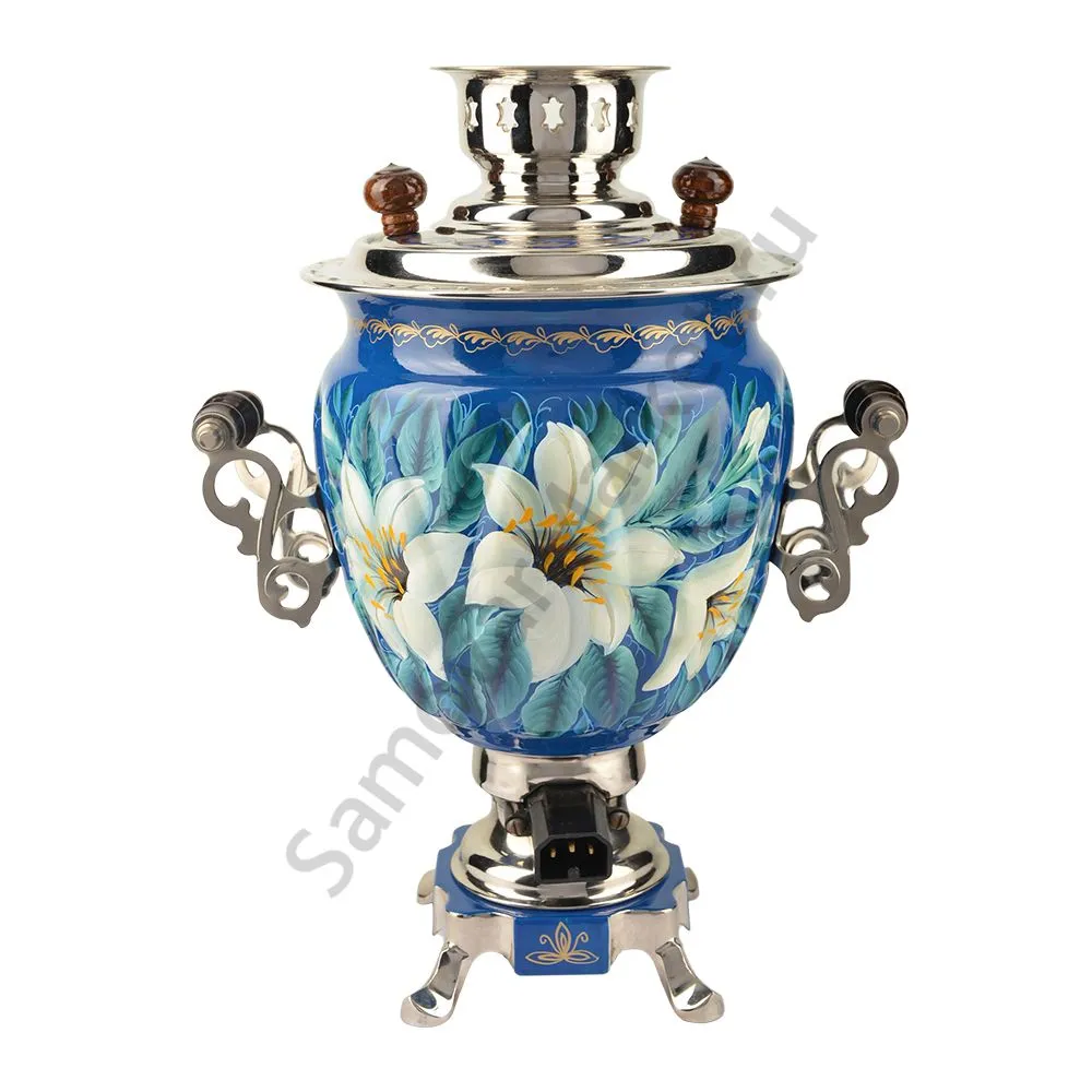 Работает от сети 220 V. К самовару прилагается шнур, красочная упаковка и инструкция по эксплуатации.