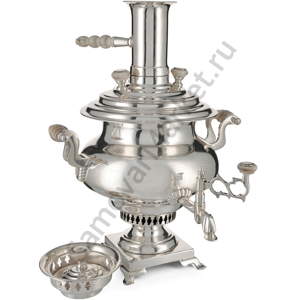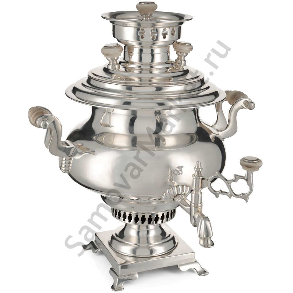 Ручки и хватки изготовлены из кости. В наших краях используется как кость – рог оленя. Это максимальн прочная фурнитура, которая украшает только самовары премиум сегмента. Прочность этого материала напрямую влияет на сложность его обработки. Самовар полностью готов к применению. Серебрение по праву является дорогим во всех отношениях украшением. Серебренное изделие подчеркивает аристократизм своего обладателя. Относительно быстро набирает богатую черноватую патину. Сделано в Туле.