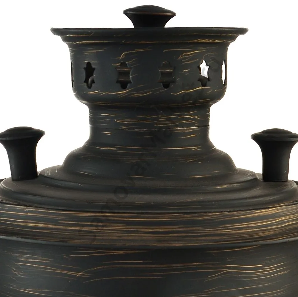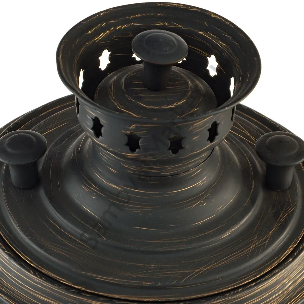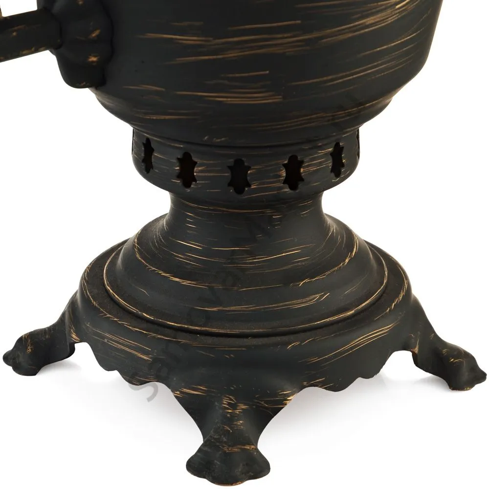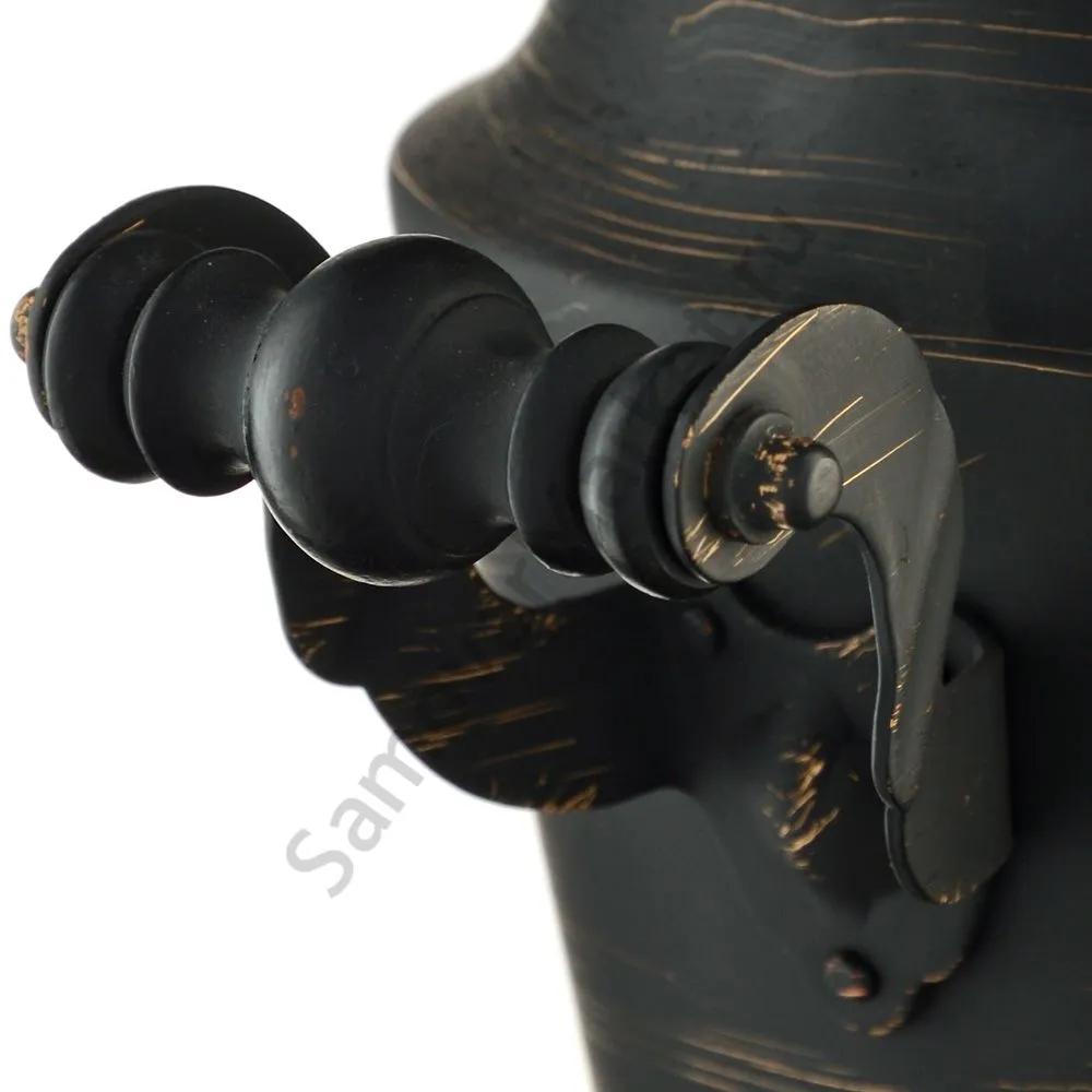 Этот самовар работает на дровах, углях, шишках, щепе. Топится он при помощи трубы, которая устанавливается сверху для образования тяги. Или при помощи сапога в качестве мехов. Внутренние стенки покрыты пищевым оловом методом гальваники.