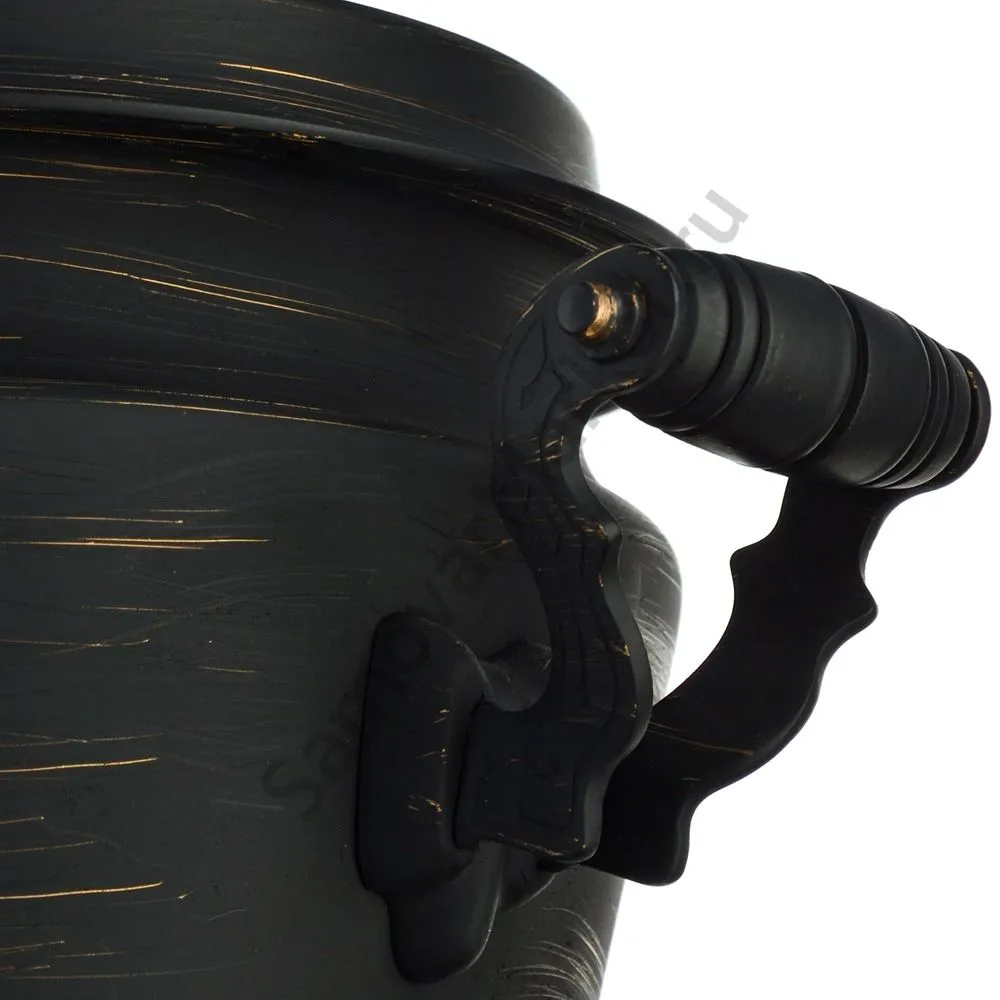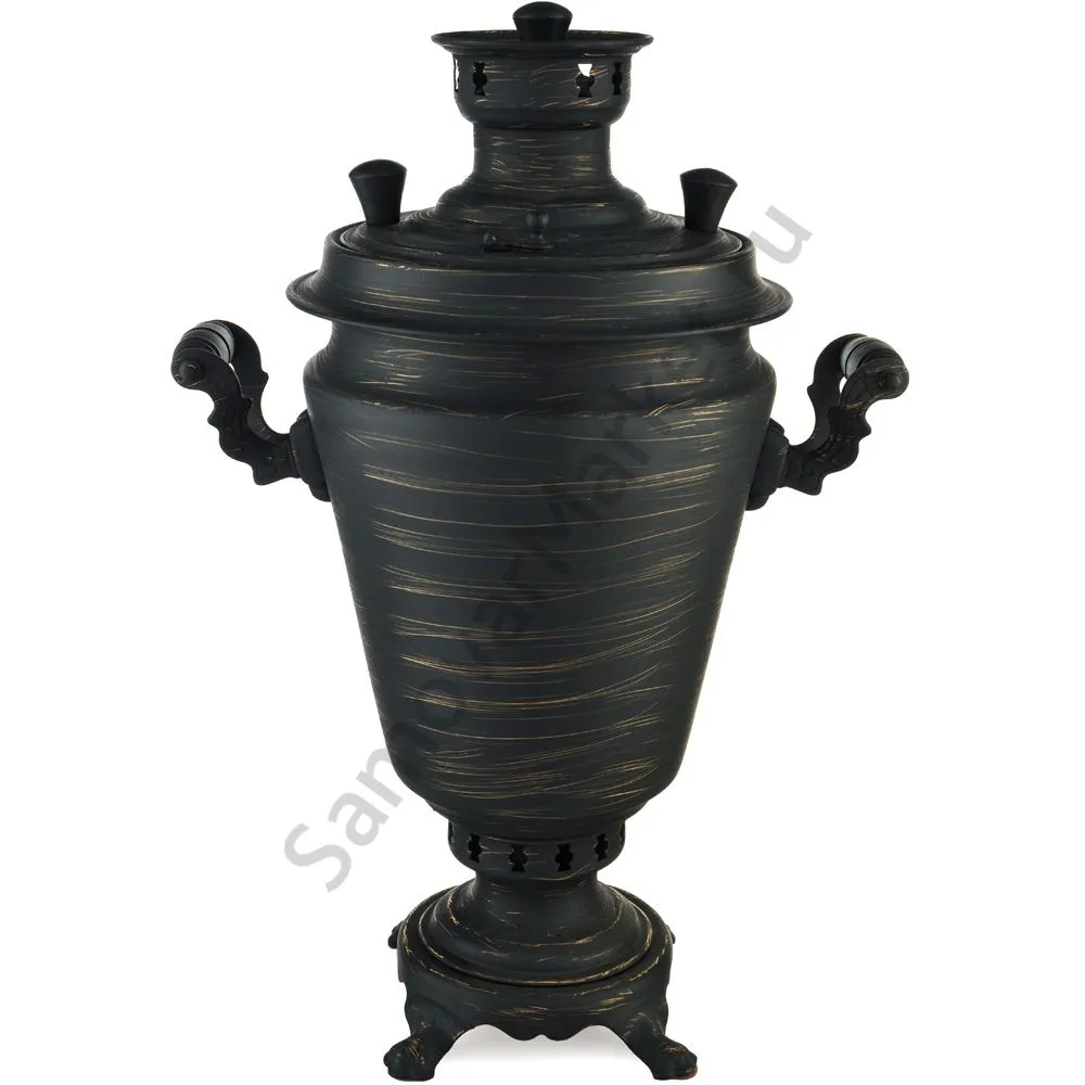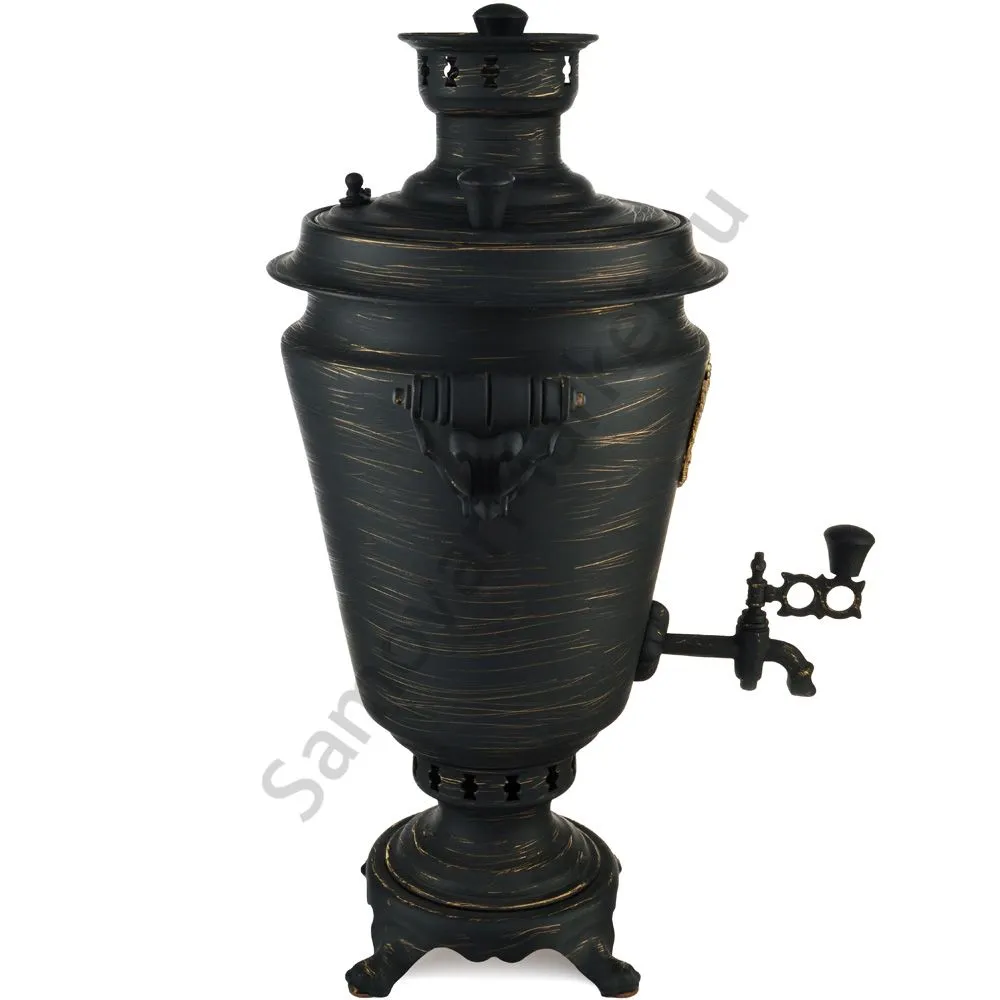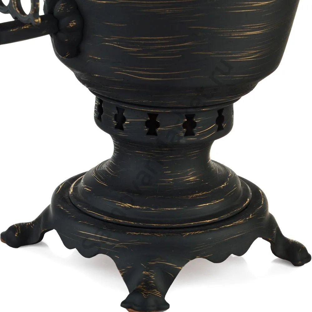 Этот самовар работает на дровах, углях, шишках, щепе. Топится он при помощи трубы, которая устанавливается сверху для образования тяги. Или при помощи сапога в качестве мехов. Внутренние стенки покрыты пищевым оловом методом гальваники.