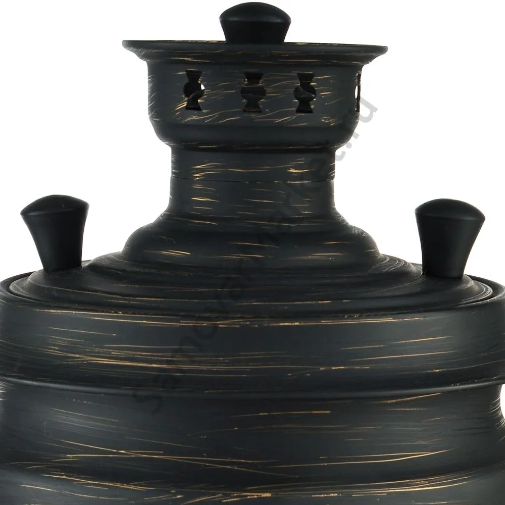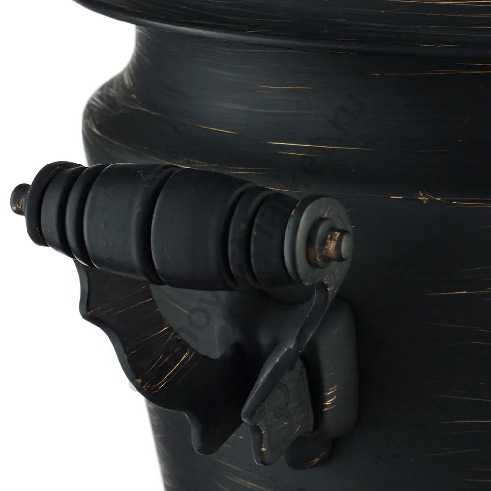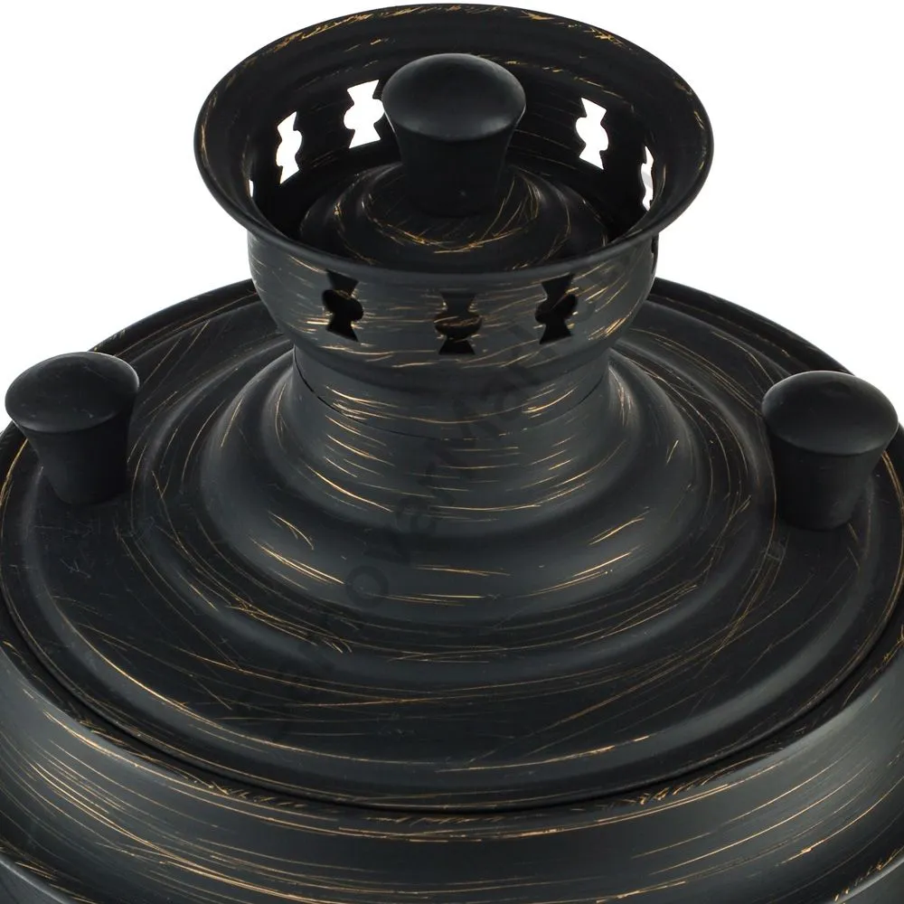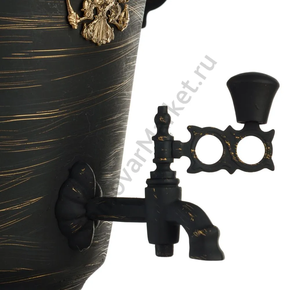 Этот самовар работает на дровах, углях, шишках, щепе. Топится он при помощи трубы, которая устанавливается сверху для образования тяги. Или при помощи сапога в качестве мехов. Внутренние стенки покрыты пищевым оловом методом гальваники.