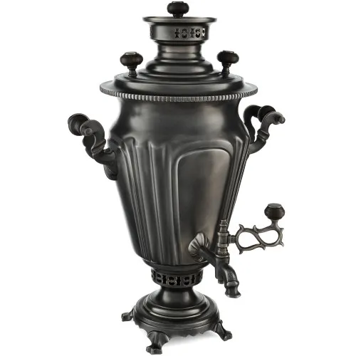 Этот самовар работает на дровах, углях, шишках, щепе. Топится он при помощи трубы, которая устанавливается сверху для образования тяги. Или при помощи сапога в качестве мехов. Внутренние стенки покрыты пищевым оловом методом гальваники.