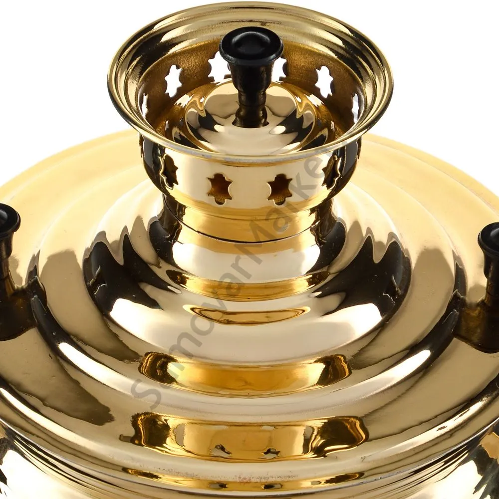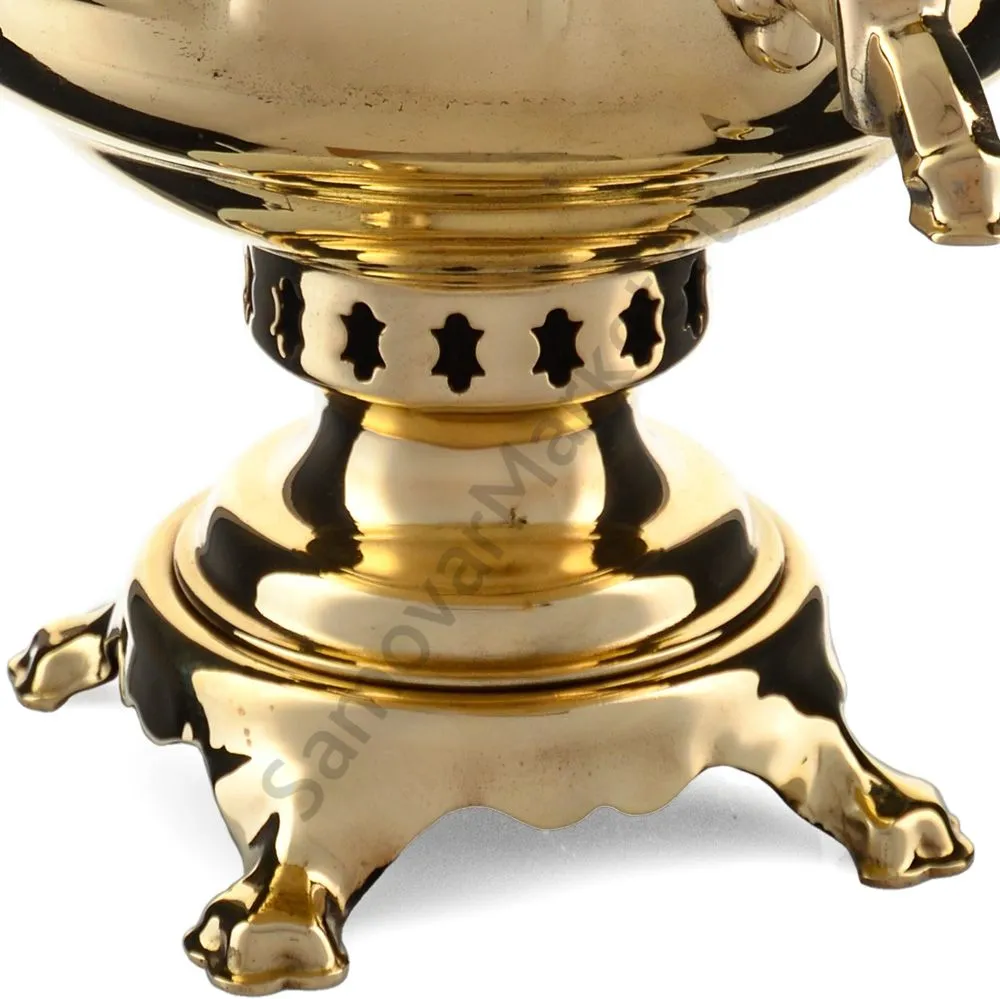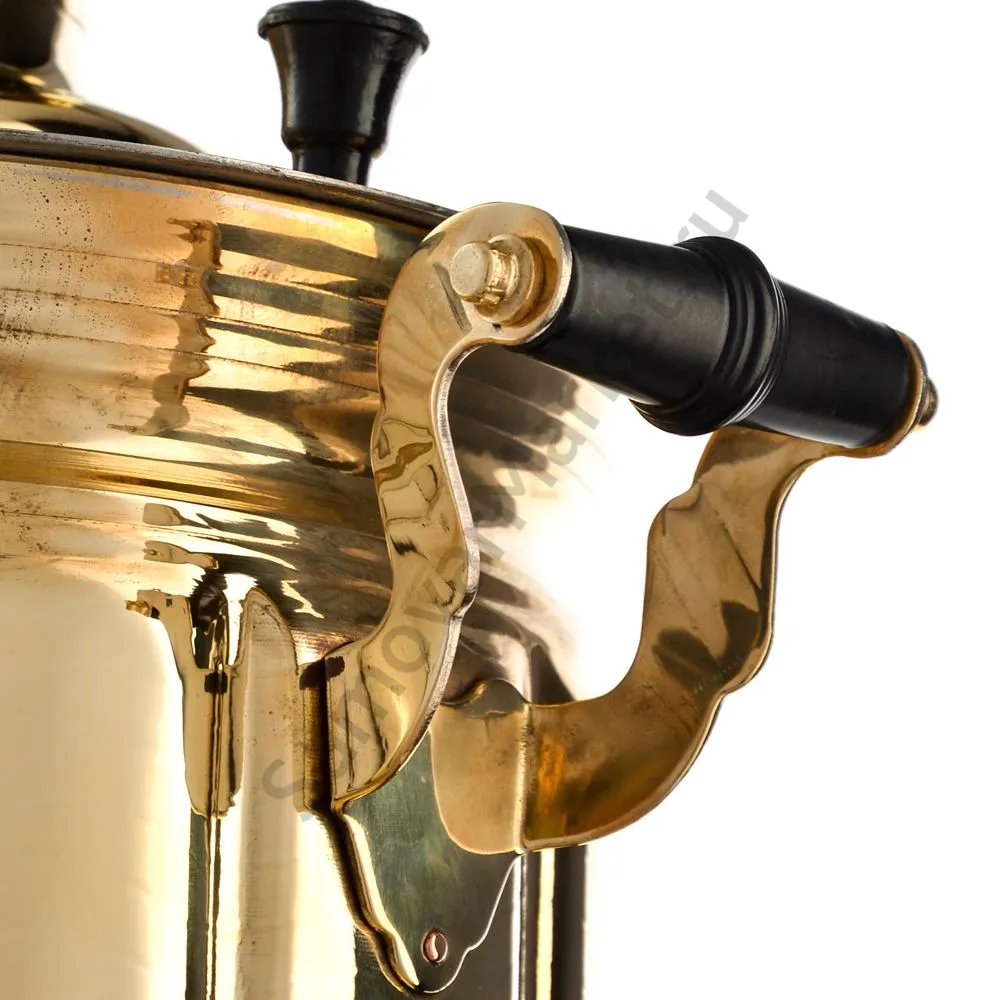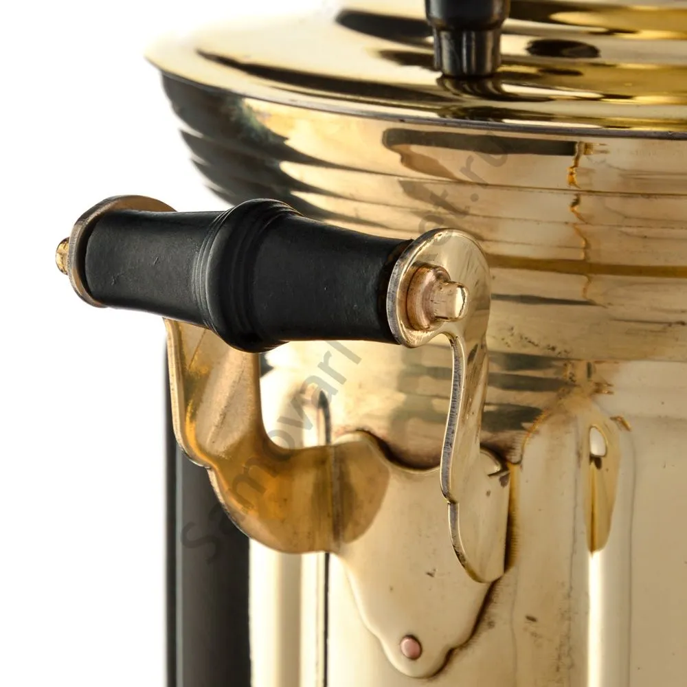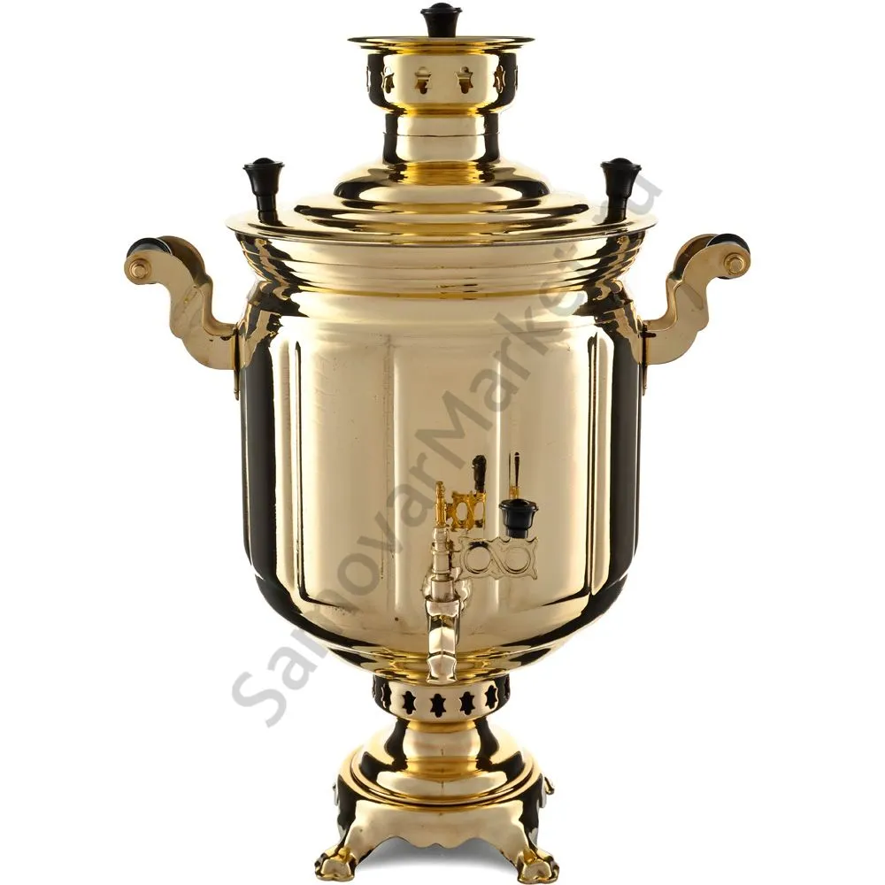 Этот самовар работает на дровах, углях, шишках, щепе. Топится он при помощи трубы, которая устанавливается сверху для образования тяги. Или при помощи сапога в качестве мехов. Внутренние стенки покрыты пищевым оловом методом гальваники.